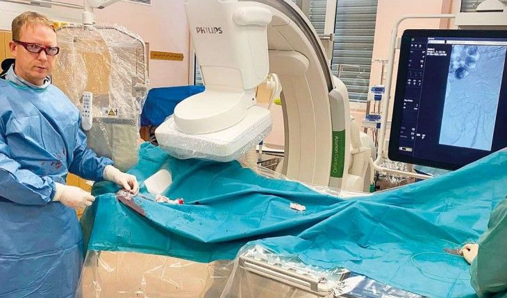 Pacientem byl muž, který v minulosti podstoupil složitý cévní bypass do pánevních tepen. Nyní mu však hrozil akutní uzávěr a s tím spojené vážné komplikace. Vzhledem k jeho anamnéze a předchozím operacím v oblasti třísel zvolili lékaři netradiční a k tkáni mimořádně šetrnou cestu – přes pravé zápěstí ruky. Zatímco u kardiologických zákroků na srdečních tepnách je vstup přes zápěstí (radiální tepnu) dnes již standardem, u cév dolních končetin jde o novinku. Důvodem je především vzdálenost. „Pro výkony na tepnách dolních končetin vedených přes ruku je zapotřebí specifické, velmi dlouhé instrumentarium, které dosáhne ze zápěstí až do nohy. Pacient s tímto konkrétním typem postižení stehenních tepen byl touto metodou ošetřen v Česku poprvé,“ vysvětluje MUDr. Jerzy Bezecny, zástupce primáře Interního oddělení a vedoucí angiologického programu AGEL nemocnice Ostrava-Vítkovice.